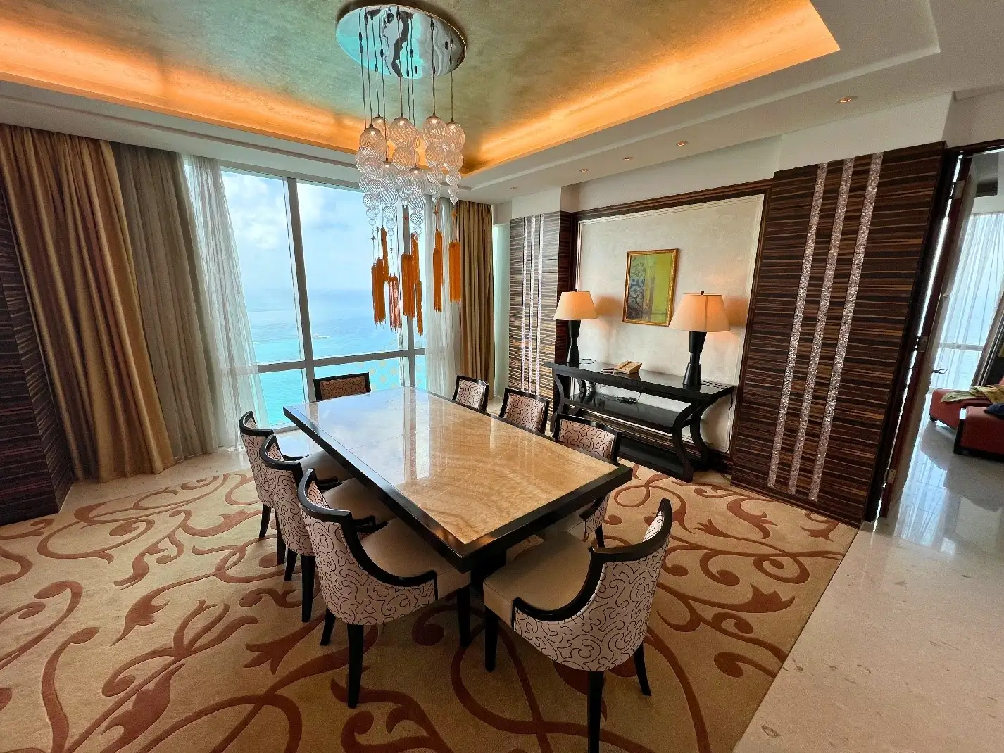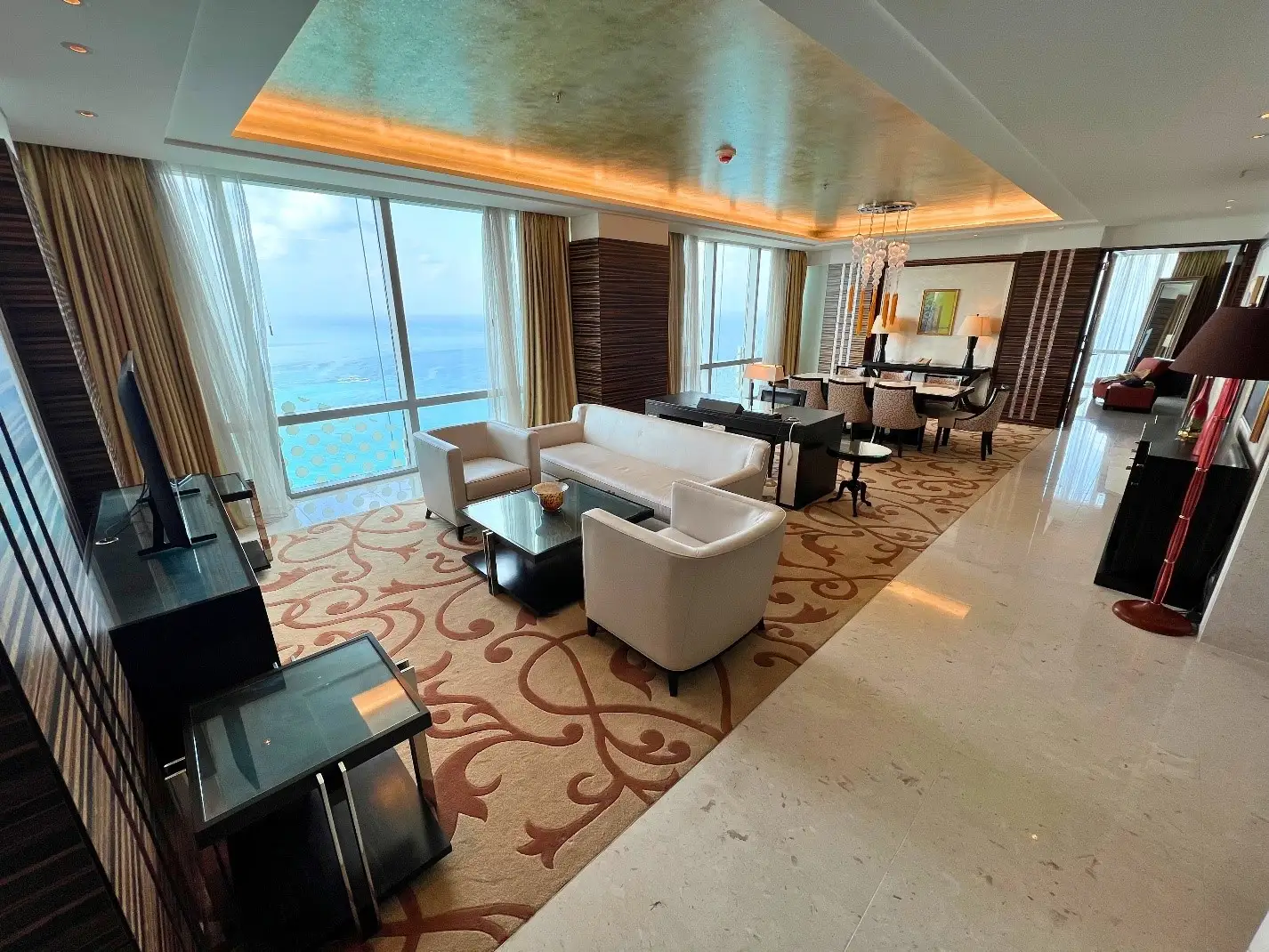 The Ambassador Suite offers an exceptional blend of sophistication and exclusivity. It features a master king-size bedroom, a spacious living room, an elegant dining area, and a fully equipped kitchen with a private access door. The suite is enhanced with a private Jacuzzi and premium branded toiletries, elevating the overall sense of comfort and indulgence. Every room offers uninterrupted sea views, ensuring a serene and private experience for distinguished guests. For added flexibility, a secondary master bedroom can be added as a connected room, making the suite ideal for families or guests seeking extra comfort and space.